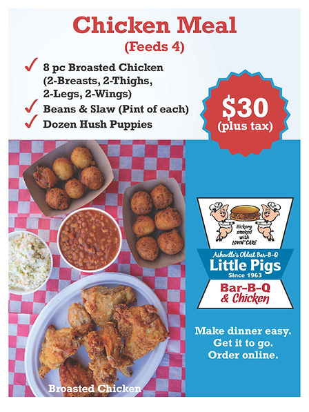 Since 1963, family owned and independently operated Little Pigs BBQ has been serving locals and visitors alike Asheville's best BBQ and chicken. Only a half-mile from the entrance to Biltmore, Little Pigs looks forward to serving you, and your friends and family, in our family's restaurant or take it to go! Whether it's your first time or your 50th, you will enjoy our warm and inviting atmosphere. Come and experience an Asheville tradition: Little Pigs BBQ.